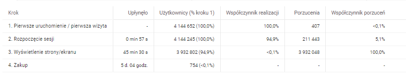 Ulgę odczują także Ci, którym zależy na pomiarze czasu między zdarzeniami. W Universal Analytics czas mierzony był na poziomie stron, sesji czy użytkowników (ze względu na model danych). W nowym Google Analytics możemy w lejku ze zdarzeniami zobaczyć metrykę czas między zdarzeniami, czyli oszacowanie ile czasu zajęła użytkownikowi określona akcja, np. wypełnienie formularza.