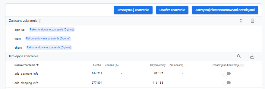 Proces analityczny, tak jak wiele innych, wraz z rozwojem narzędzi miewa powtarzalne elementy. Twórcy nowej wersji narzędzia dostrzegli to i GA4 zostało zaopatrzone w automatyczne zbieranie typowych zdarzeń – przewijanie strony, kliknięcia w linki zewnętrzne, wyszukiwanie, interakcje z video oraz pobrania plików. Dzięki temu, wraz z rozwojem tej technologii, będziemy mogli więcej czasu poświęcić niestandardowym elementom każdego serwisu/aplikacji. W panelu Google Analytics 4 zobaczymy również rekomendacje w zakresie tego, jakie dodatkowe zdarzenia możemy zbierać, np. login.