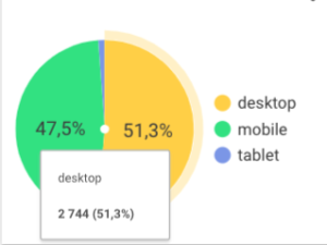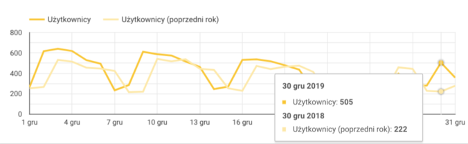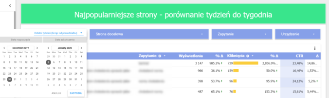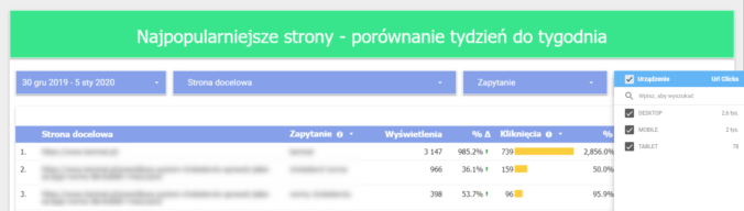 Dużą zaletą narzędzia jest możliwość samodzielnej zmiany zakresu dat oraz danych. Po otrzymaniu linka możemy przeanalizować dane nie tylko z domyślnego “ostatniego miesiąca”, ale z jakiegokolwiek okresu jaki nas interesuje. Odbiorca może filtrować dane (np. po rodzaju urządzenia, z którego pochodzą sesje) oraz daty w obrębie całego raportu lub wybranych sekcji.